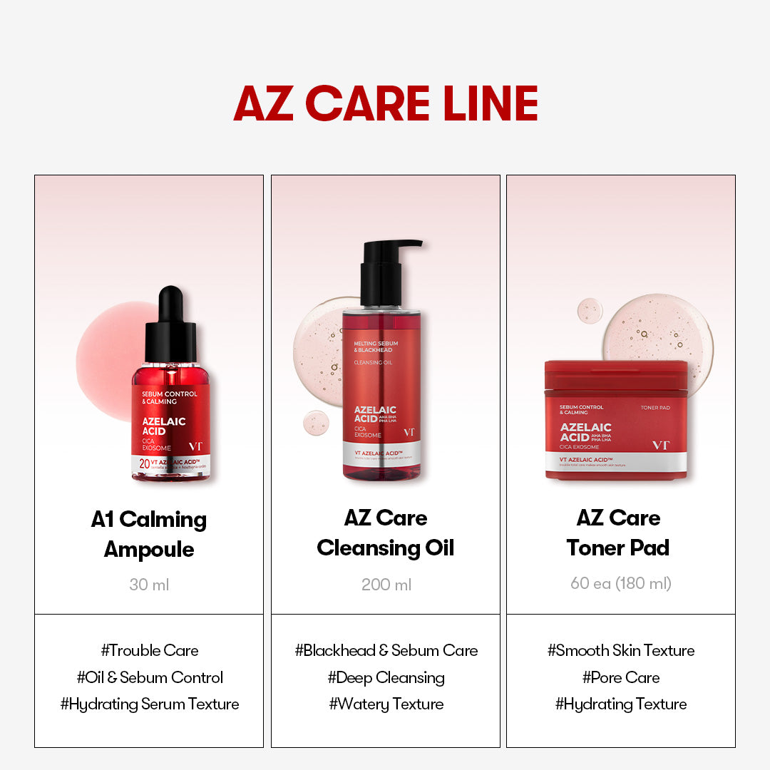 VT Cosmetics AZ Care Toner Pad is a daily soothing toner pad that helps improve the look of pores, balance sebum, and refine overall skin texture using azelaic acid derivatives, multi-acid exfoliants, and calming cica exosomes. The dual-sided vegan pad provides gentle exfoliation on the embossed side and soothing hydration on the flat side, making it suitable for oily, combination, or acne-prone skin. Its mildly acidic formula keeps the skin comfortable without tightness while supporting a smoother, clearer complexion.