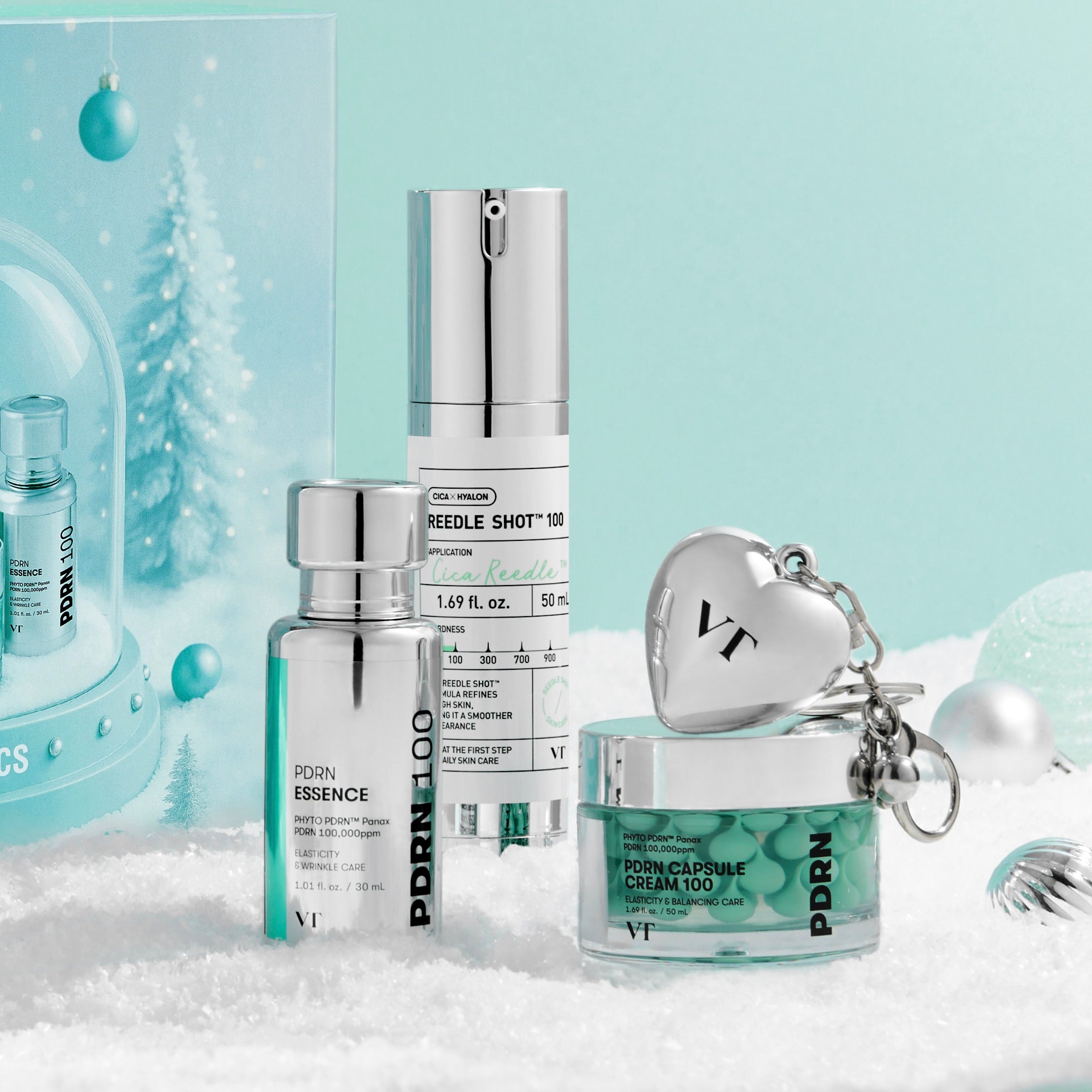 • Top 3 VT bestsellers in one box: REEEDLE SHOT™ 100, PDRN Essence 100, and PDRN Capsule Cream 100 are some of VT’s most-loved formulas for visible care of texture, elasticity, and moisture.