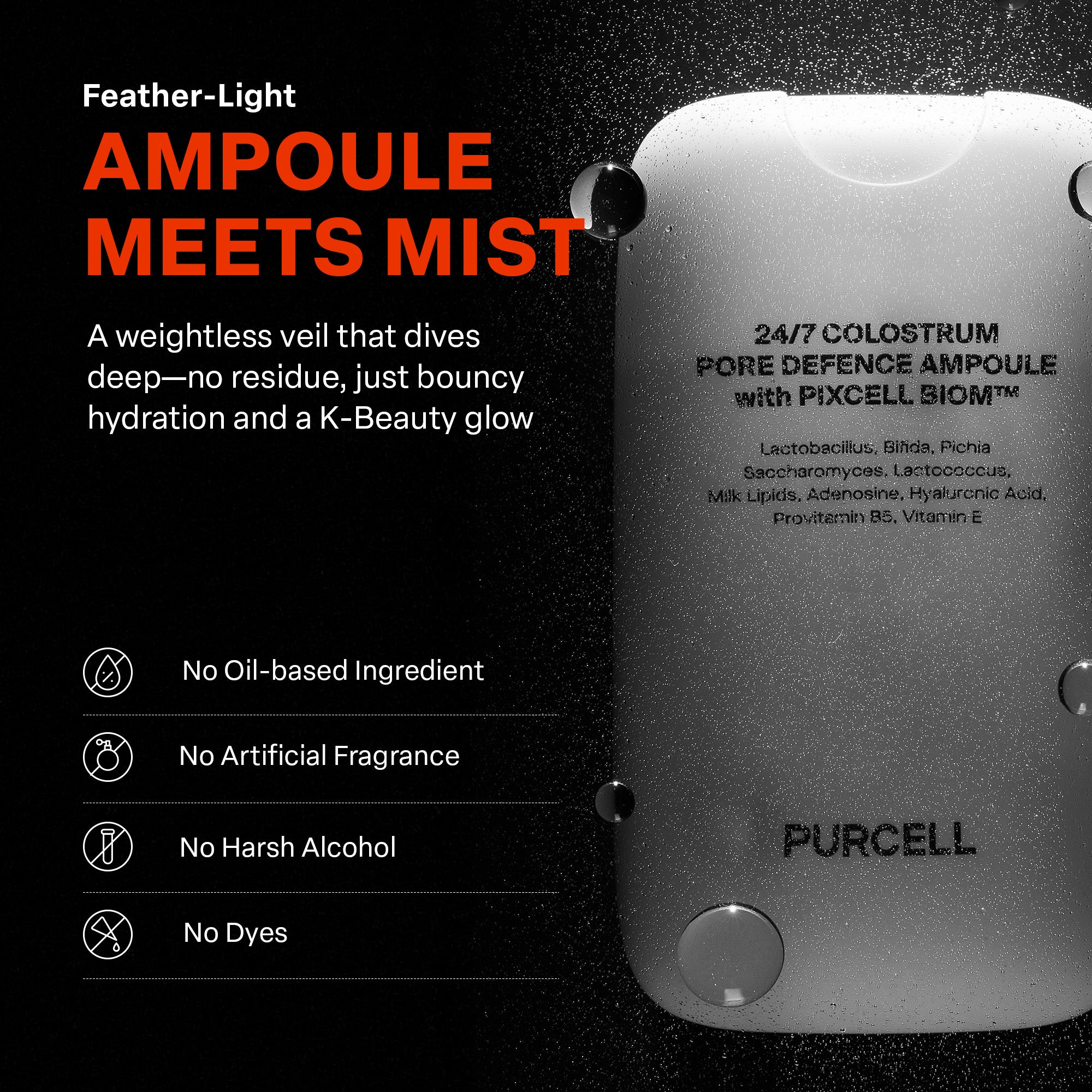 PURCELL 24/7 Colostrum Pore Defence Ampoule with Pixcell Biom™ is a fine facial mist with an ampoule-grade concentrated formula—made to deliver lightweight hydration while helping skin look smoother, more refined, and fresh throughout the day.
